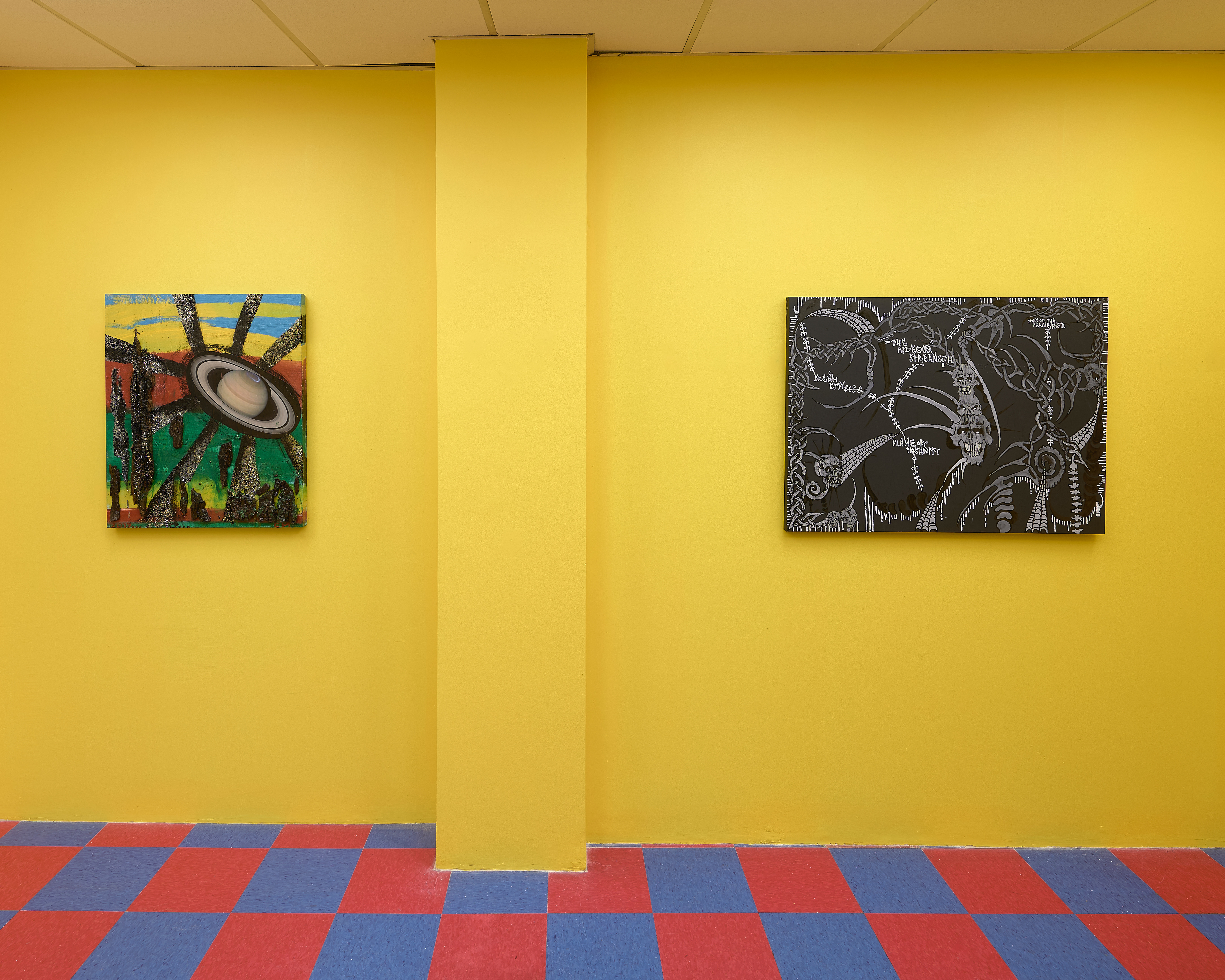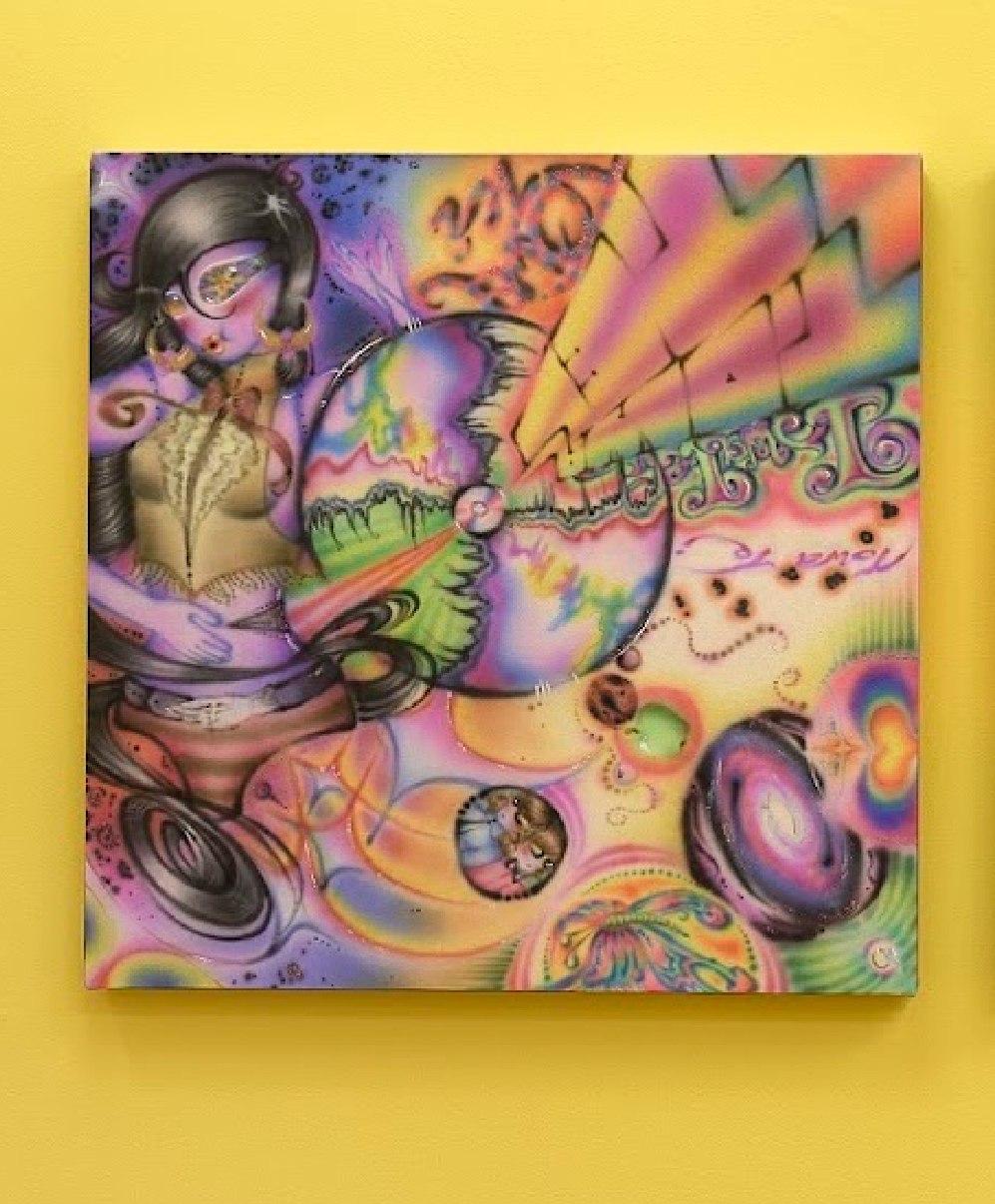 Featuring artists who speak fluently in color, iconography, and emotional intensity, the exhibition radiates with heat and urgency. Chris Martin’s ecstatic abstractions thrum with texture and spiritual force, while COCO144 and LAWE aka Chris Capuozzo channel their legendary graffiti lineage into walls alive with motion and coded poetry. Chloée Maugile and Abella D’Adamo conjure explosive, glittering scenes rich with cinematic allusion, musical echoes, fantasy, and obsession. Hunter Ney dissects pop culture’s decay and its manufactured myths, and Ruth Angel Edwards weaves punk incantation with a kind of feminist media shamanism. Wombat brings their signature energy indoors with a new painting that translates the chaotic rhythms of the street into a feral, heat-drunk canvas pulsing with defiance and delirium.